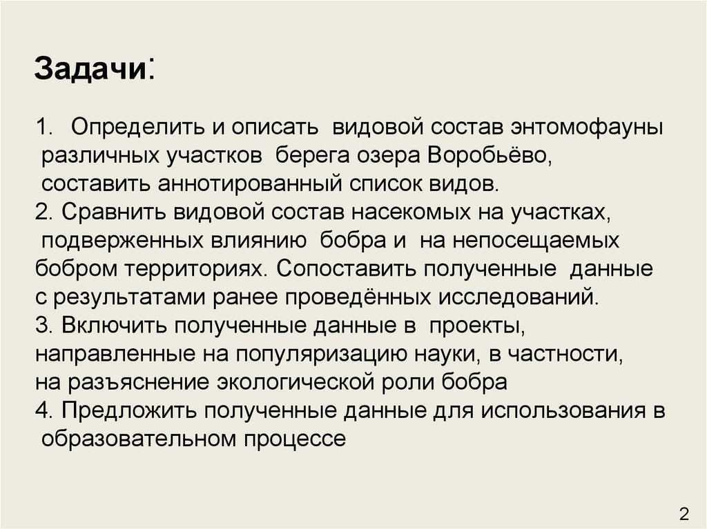 1. Определить и описать видовой состав энтомофауныразличных участков берега озера Воробьёво,