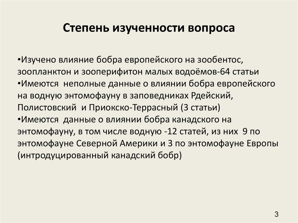 Степень изученности вопроса•Изучено влияние бобра европейского на зообентос,