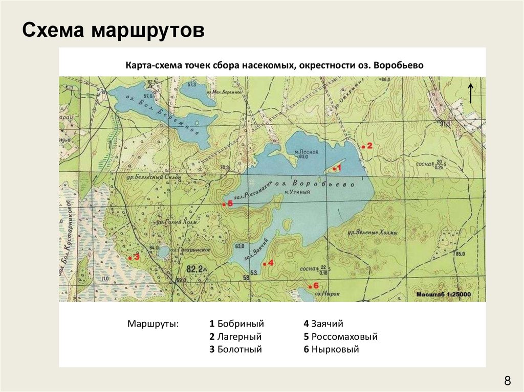 Схема маршрутовКарта-схема точек сбора насекомых, окрестности оз. Воробьево