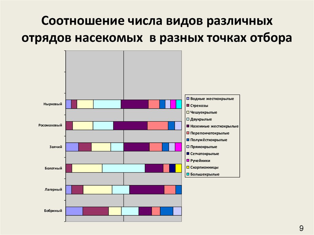 Соотношение числа видов различныхотрядов насекомых в разных точках отбора