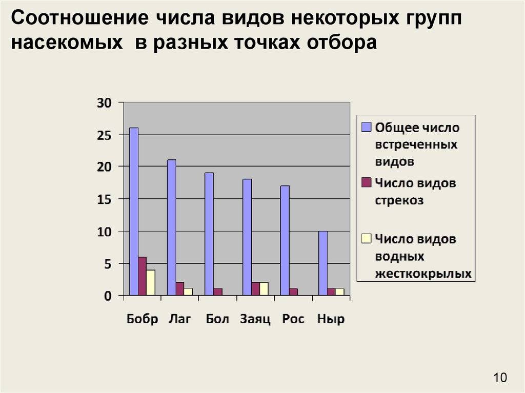 Соотношение числа видов некоторых группнасекомых в разных точках отбора
