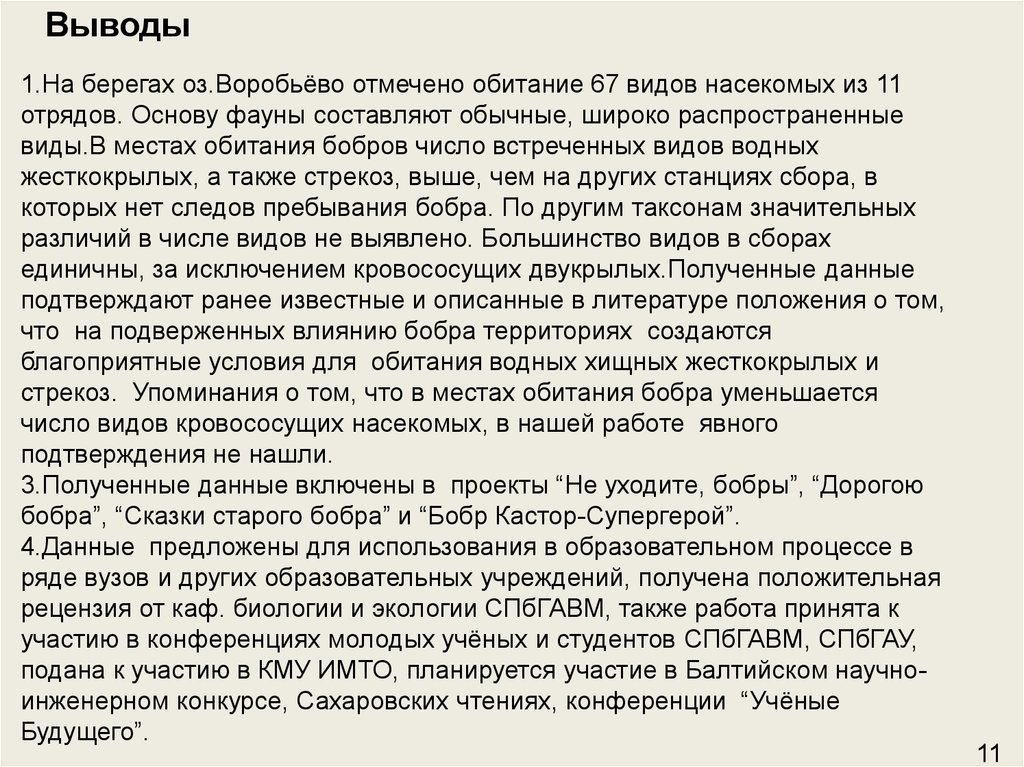 Выводы1.На берегах оз.Воробьёво отмечено обитание 67 видов насекомых из 11