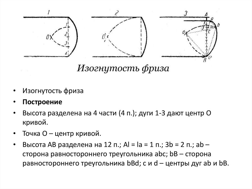 • Высота разделена на 4 части (4 п.); дуги 1-3 дают центр O