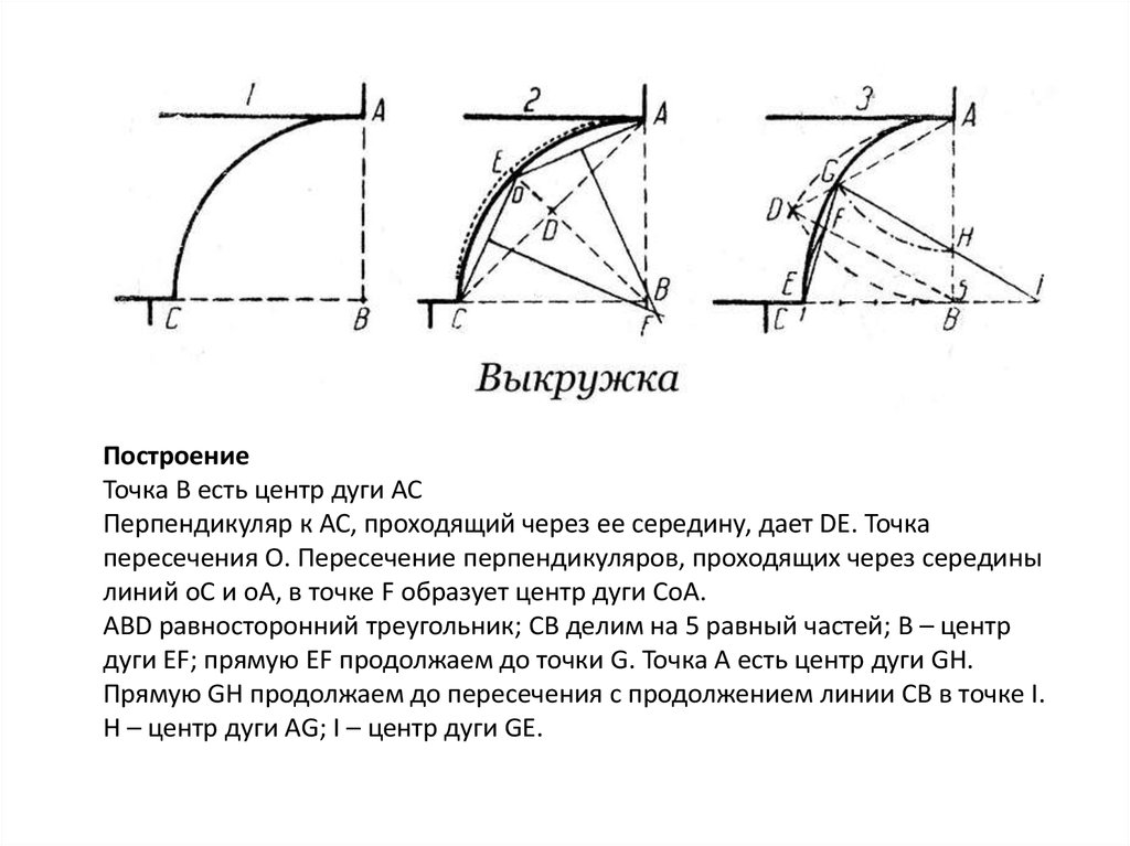 – 2 п.) продолжнение прямой DE дает точку F – центр дуги GD. Точка E – центр дуги