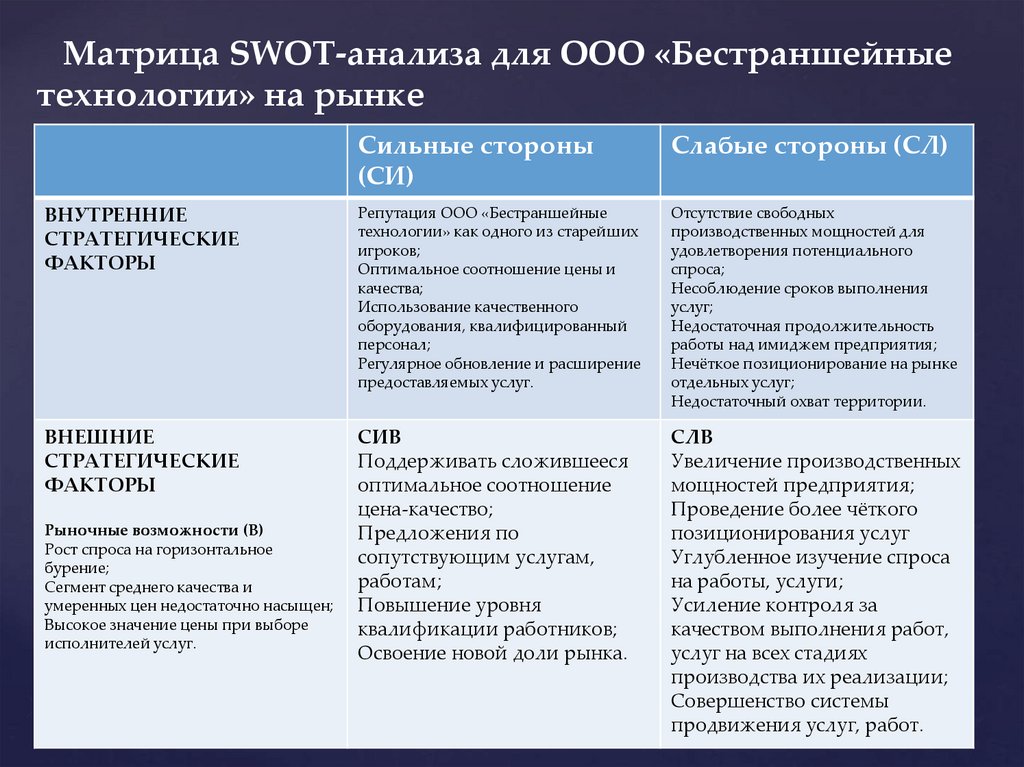 Матрица SWOT-анализа для ООО «Бестраншейныетехнологии» на рынке.