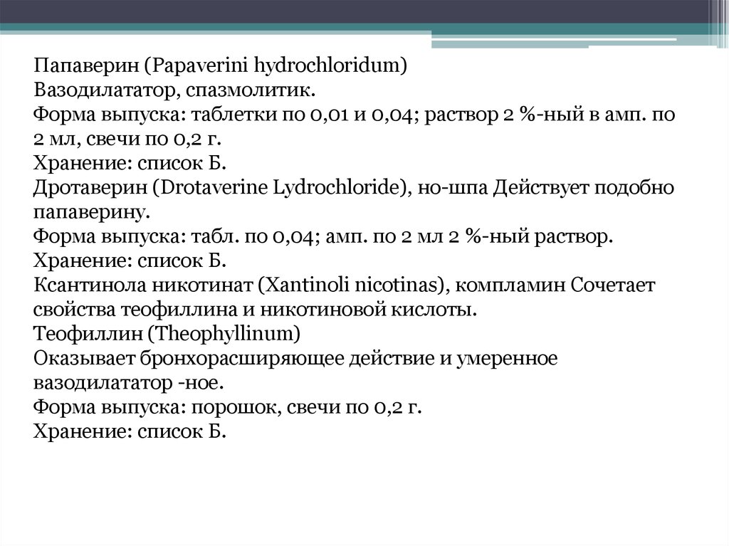 Папаверин (Papaverini hydrochloridum)Вазодилататор, спазмолитик.