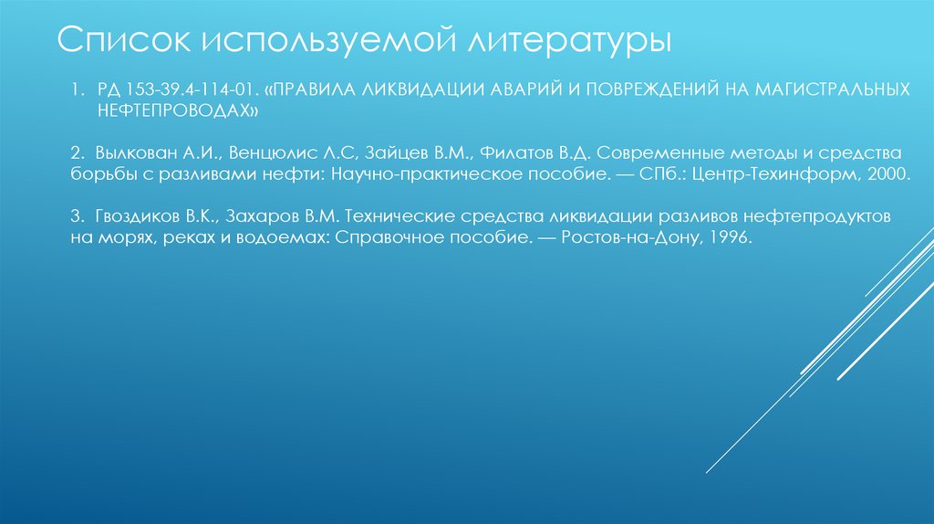 Список используемой литературы1. РД 153-39.4-114-01. «ПРАВИЛА ЛИКВИДАЦИИ АВАРИЙ И ПОВРЕЖДЕНИЙ НА МАГИСТРАЛЬНЫХ