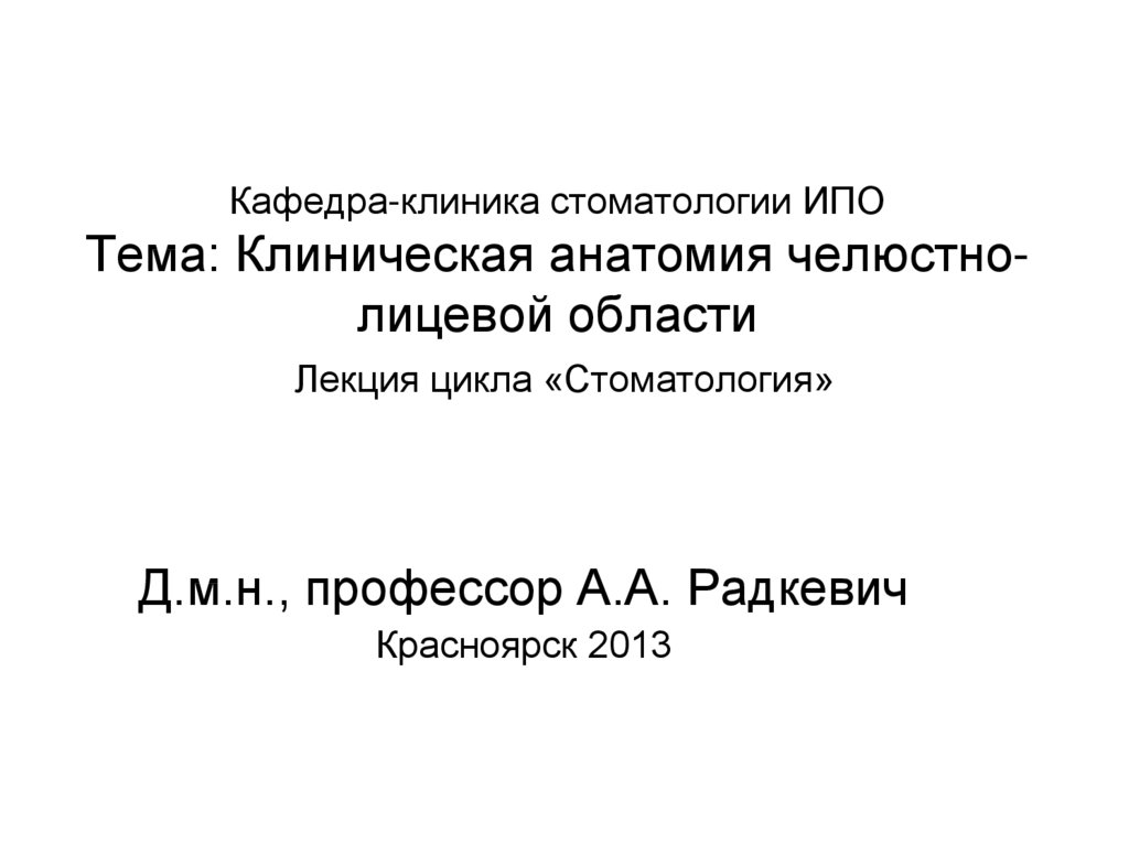 1. Кафедра-клиника стоматологии ИПО Тема: Клиническая анатомия челюстно-лицевой области Лекция цикла «Стоматология»