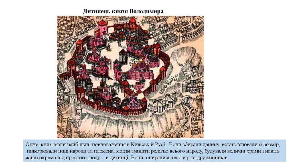 Дитинець князя ВолодимираОтже, князі мали найбільші повноваження в Київській Русі. Вони збирали данину, встановлювали її розмір,