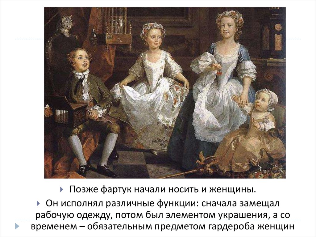 Позже фартук начали носить и женщины.Он исполнял различные функции: сначала замещал