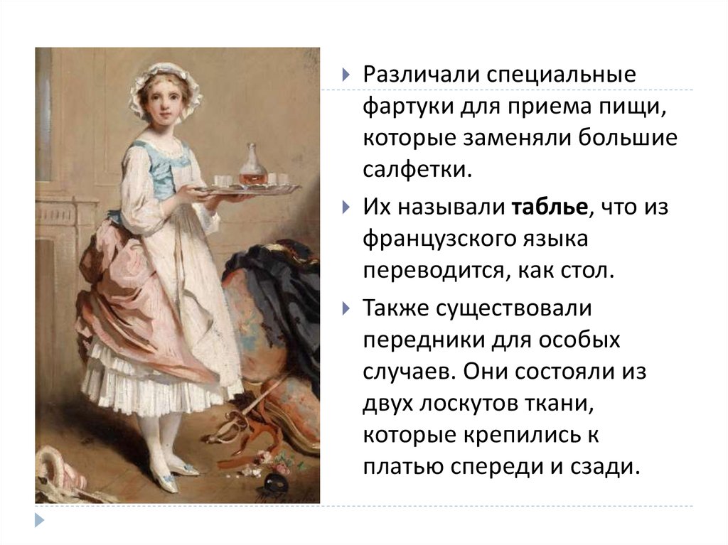 Различали специальныефартуки для приема пищи,