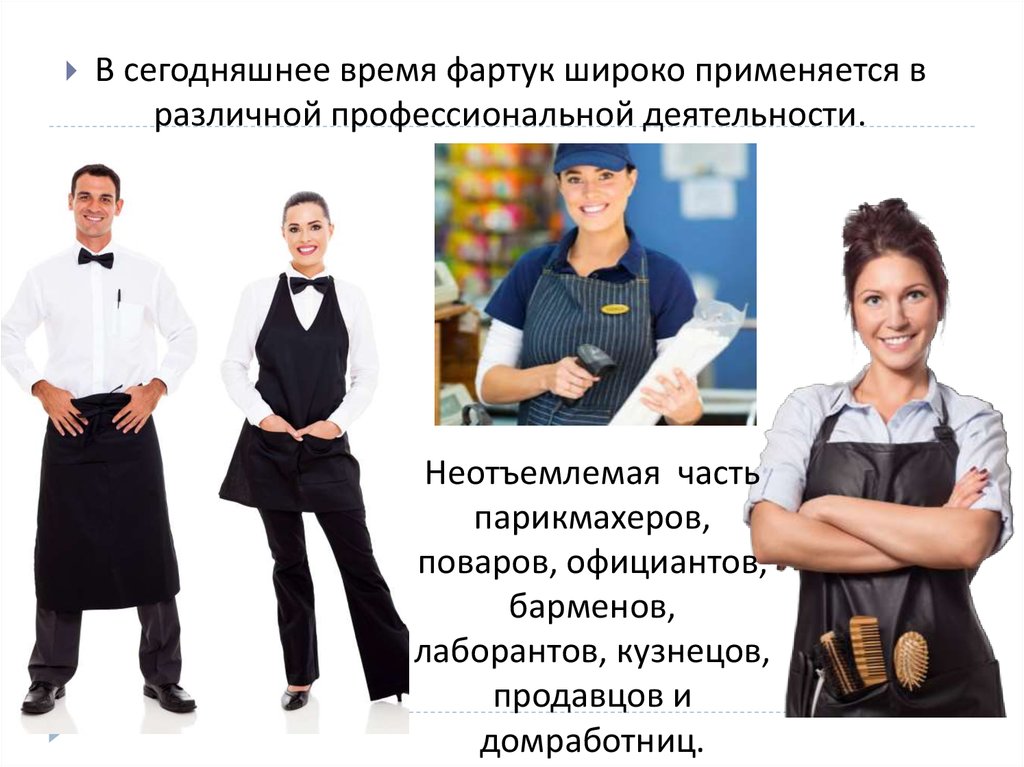 В сегодняшнее время фартук широко применяется вразличной профессиональной деятельности.