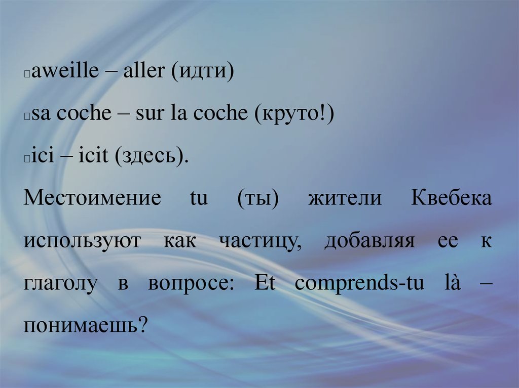aweille – aller (идти)sa coche – sur la coche (круто!)