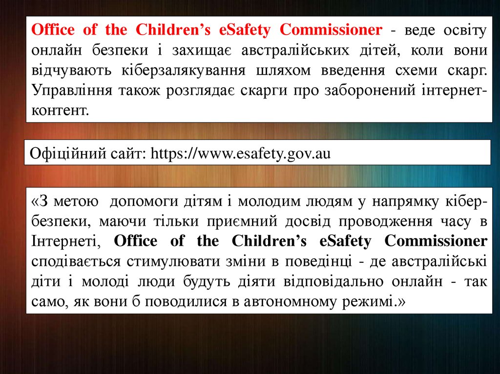 Office of the Children’s eSafety Commissioner - веде освітуонлайн безпеки і захищає австралійських дітей, коли вони