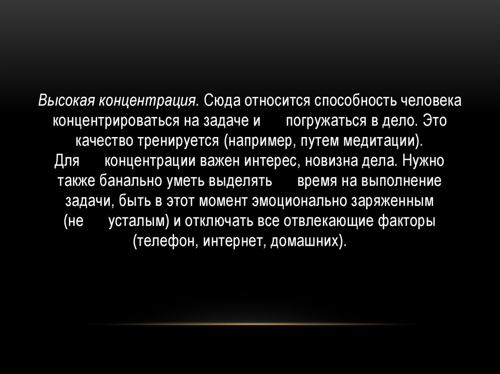 Высокая концентрация. Сюда относится способность человекаконцентрироваться на задаче и погружаться в дело. Это