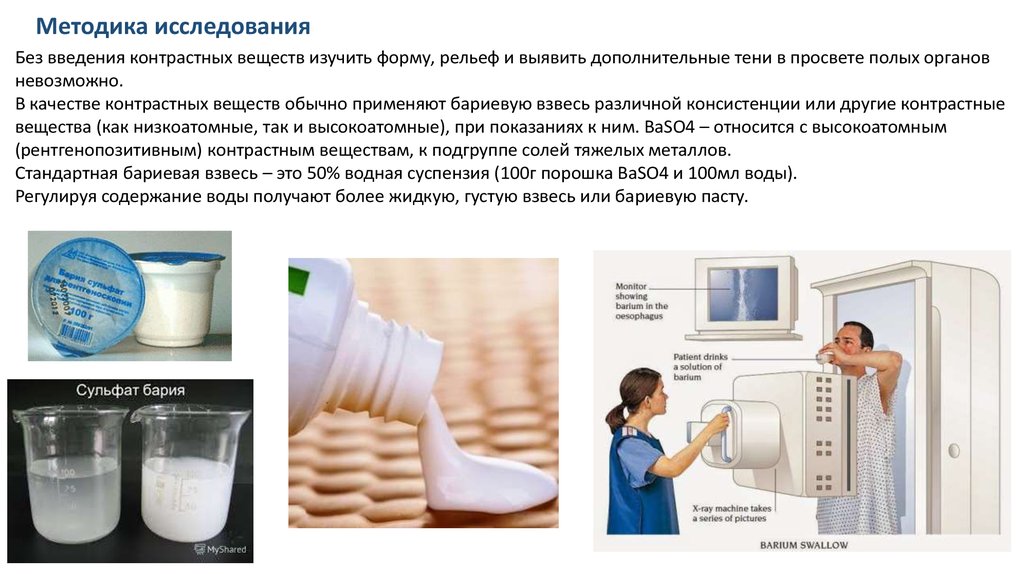 Стандартная бариевая взвесь – это 50% водная суспензия (100г порошка BaSO4 и 100мл воды).