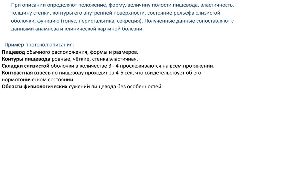Нормальный контрастированный пищевод имеет четкие, ровные и параллельные контуры с учетом вдавлений от
