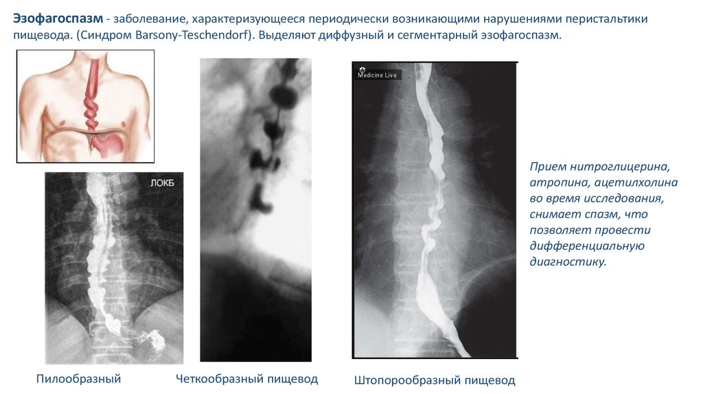 Изменчивые волнообразные или зубчатые контуры наблюдаются в пищеводе при сегментарных сокращениях его