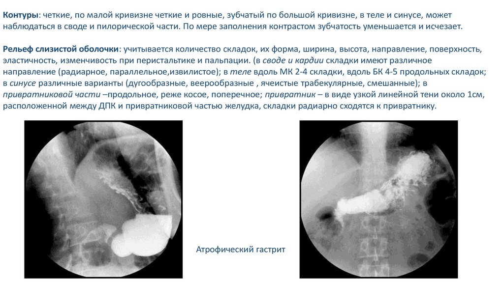 Контуры: четкие, по малой кривизне четкие и ровные, зубчатый по большой кривизне, в теле и синусе, можетнаблюдаться в своде и пилорической части. По мере заполнения контрастом зубчатость уменьшается и исчезает.