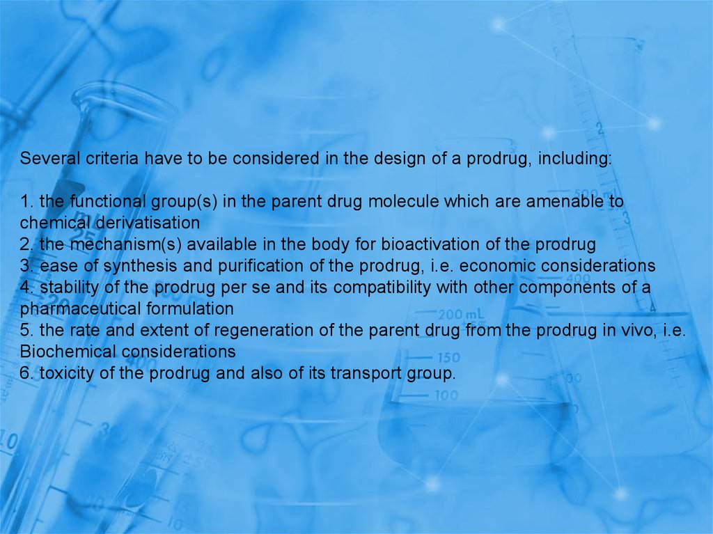 Several criteria have to be considered in the design of a prodrug, including:1. the functional group(s) in the parent drug molecule which are amenable to