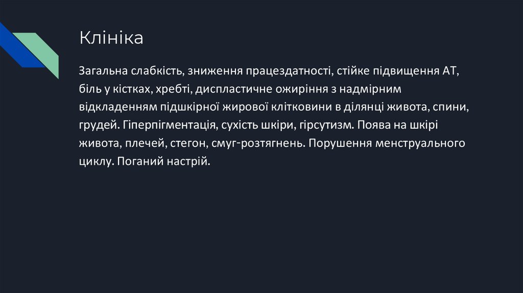 КлінікаЗагальна слабкість, зниження працездатності, стійке підвищення АТ,