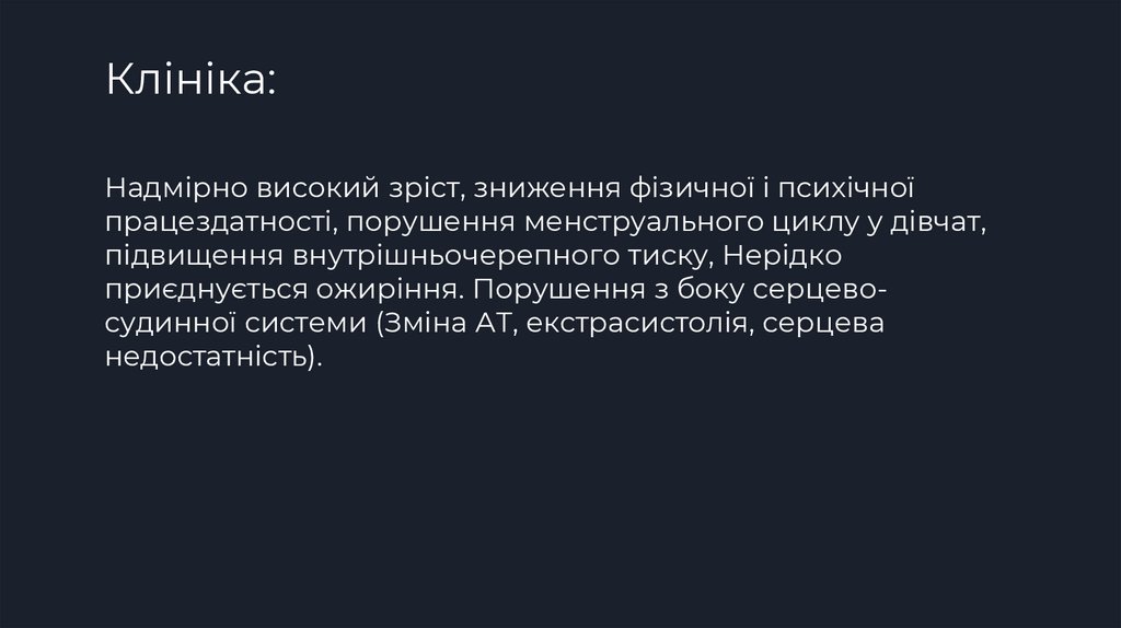 Клініка:Надмірно високий зріст, зниження фізичної і психічної
