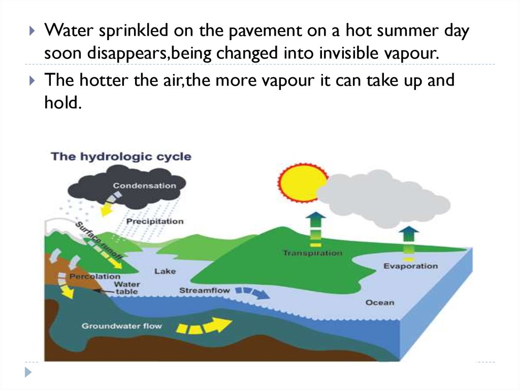 Water sprinkled on the pavement on a hot summer daysoon disappears,being changed into invisible vapour.