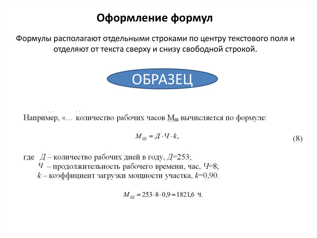 Оформление формулФормулы располагают отдельными строками по центру текстового поля и