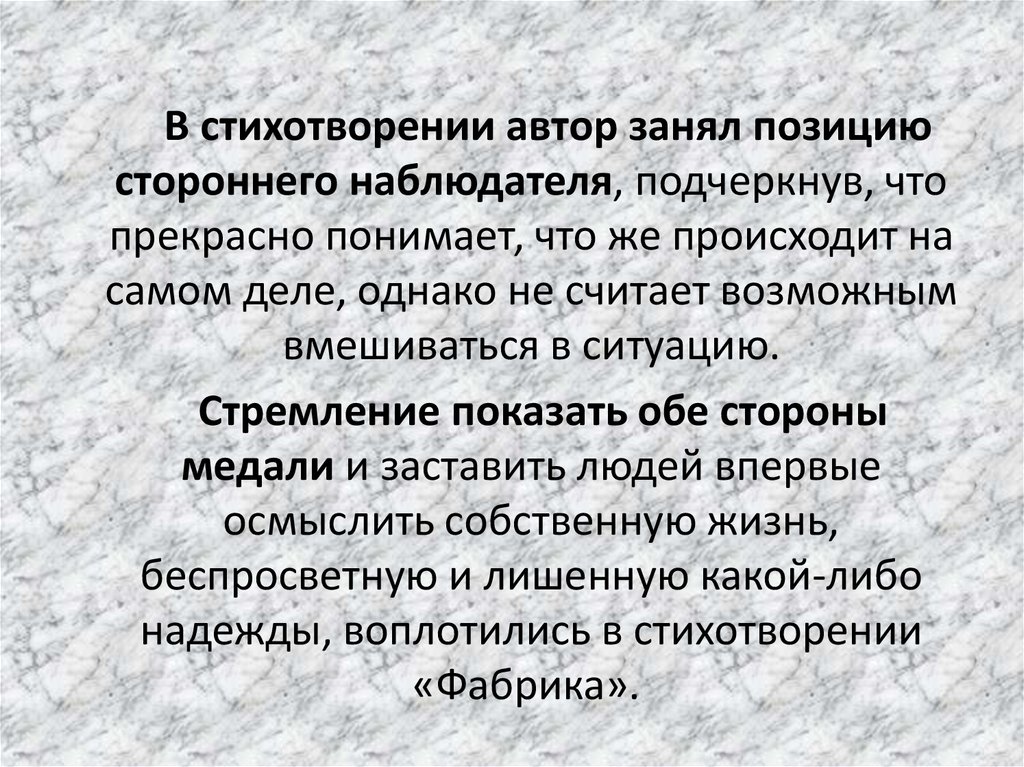 В стихотворении автор занял позициюстороннего наблюдателя, подчеркнув, что