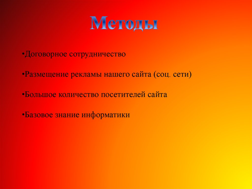 •Договорное сотрудничество•Размещение рекламы нашего сайта (соц. сети)