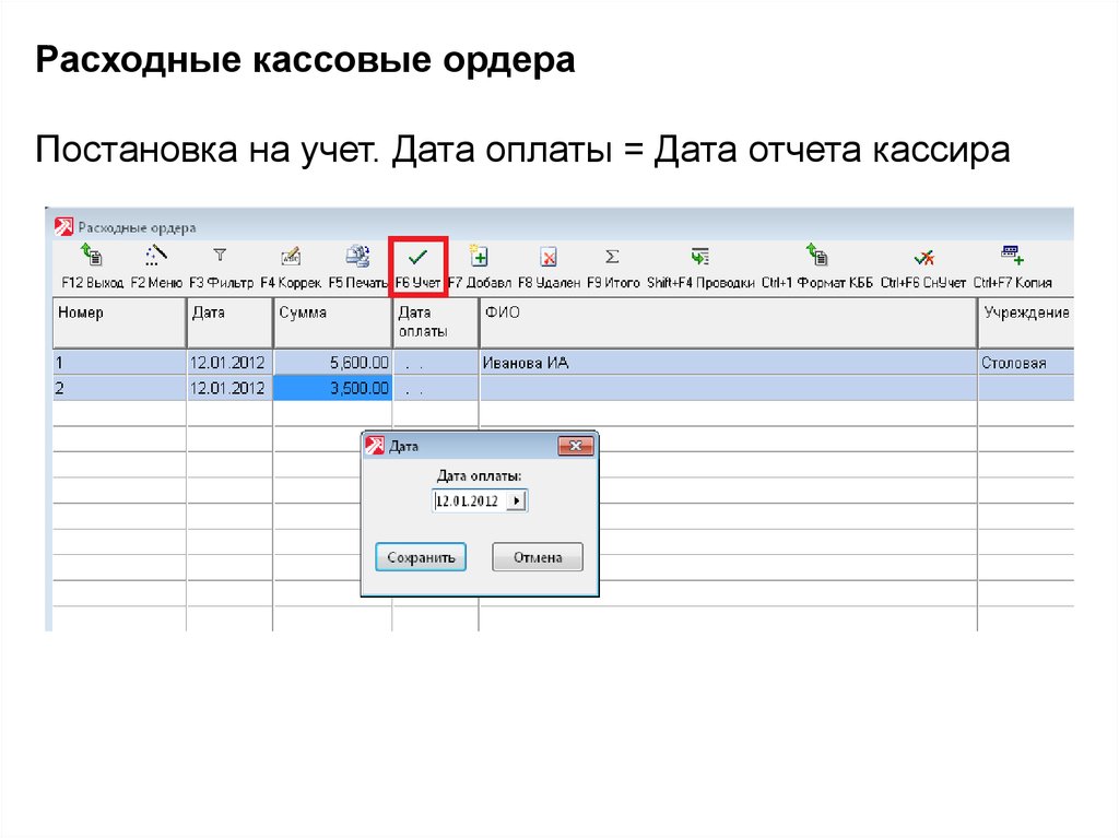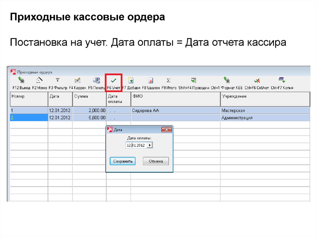 Приходные кассовые ордераПостановка на учет. Дата оплаты = Дата отчета кассира