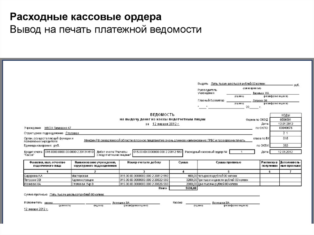 Расходные кассовые ордераВывод на печать платежной ведомости