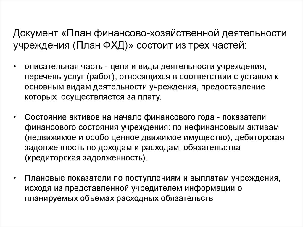 Документ «План финансово-хозяйственной деятельностиучреждения (План ФХД)» состоит из трех частей: