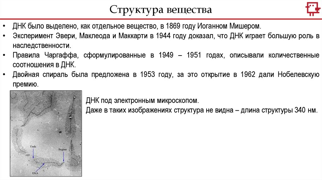 Структура вещества• ДНК было выделено, как отдельное вещество, в 1869 году Иоганном Мишером.
