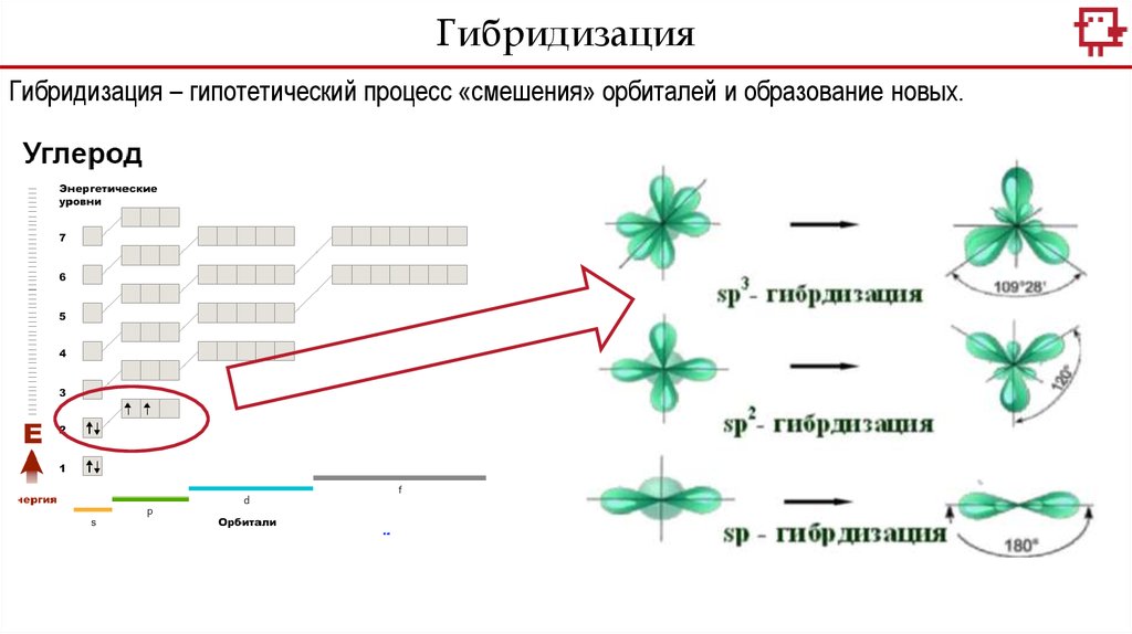 ГибридизацияГибридизация – гипотетический процесс «смешения» орбиталей и образование новых.