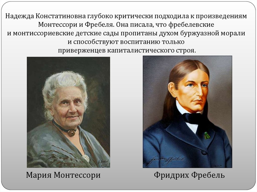 Надежда Констатиновна глубоко критически подходила к произведениямМонтессори и Фребеля. Она писала, что фребелевские
