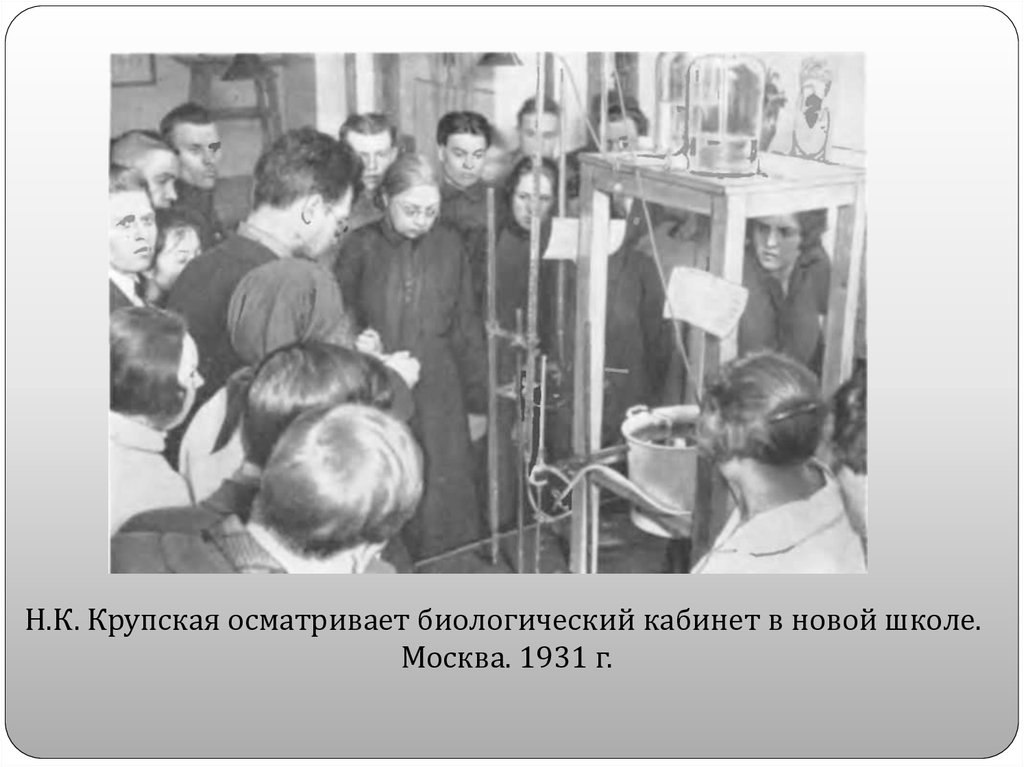 Н.К. Крупская осматривает биологический кабинет в новой школе.Москва. 1931 г.