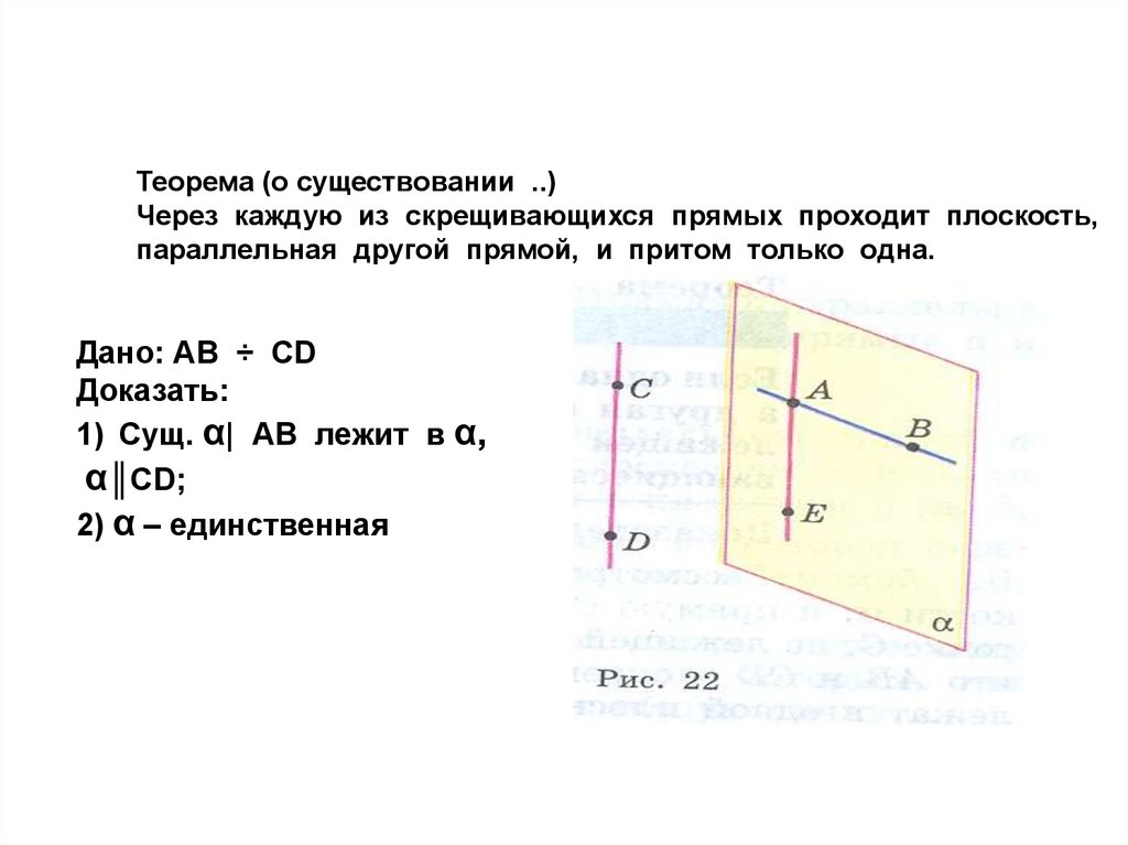 Теорема (о существовании ..)Через каждую из скрещивающихся прямых проходит плоскость,