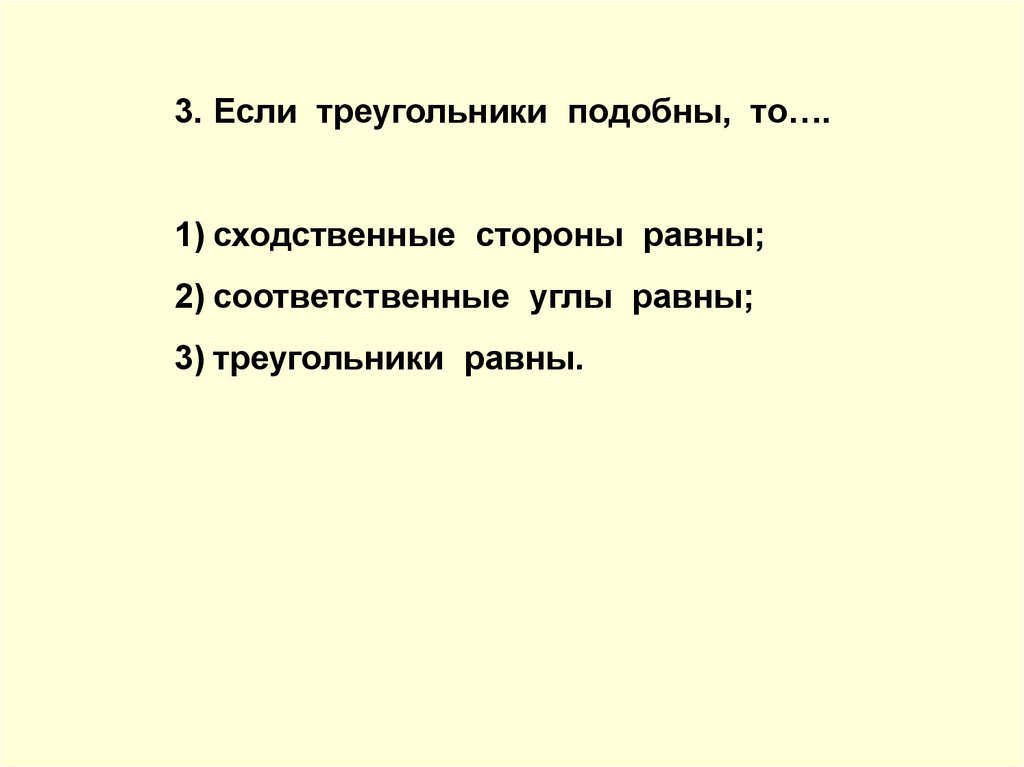 3. Если треугольники подобны, то….1) сходственные стороны равны;