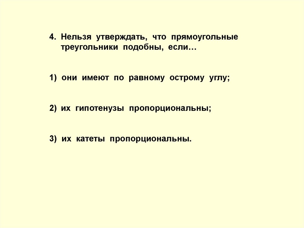 4. Нельзя утверждать, что прямоугольныетреугольники подобны, если…