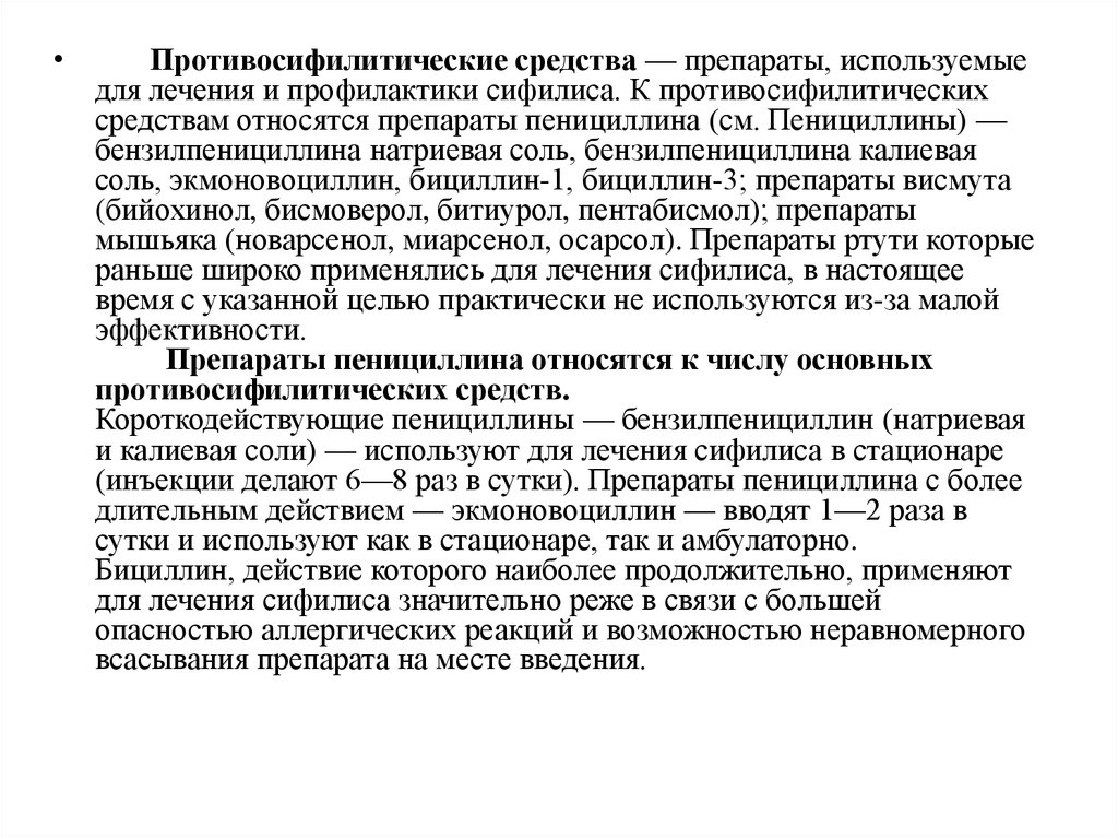• Основное место в лечении сифилиса занимают препаратыбензилпенициллина .