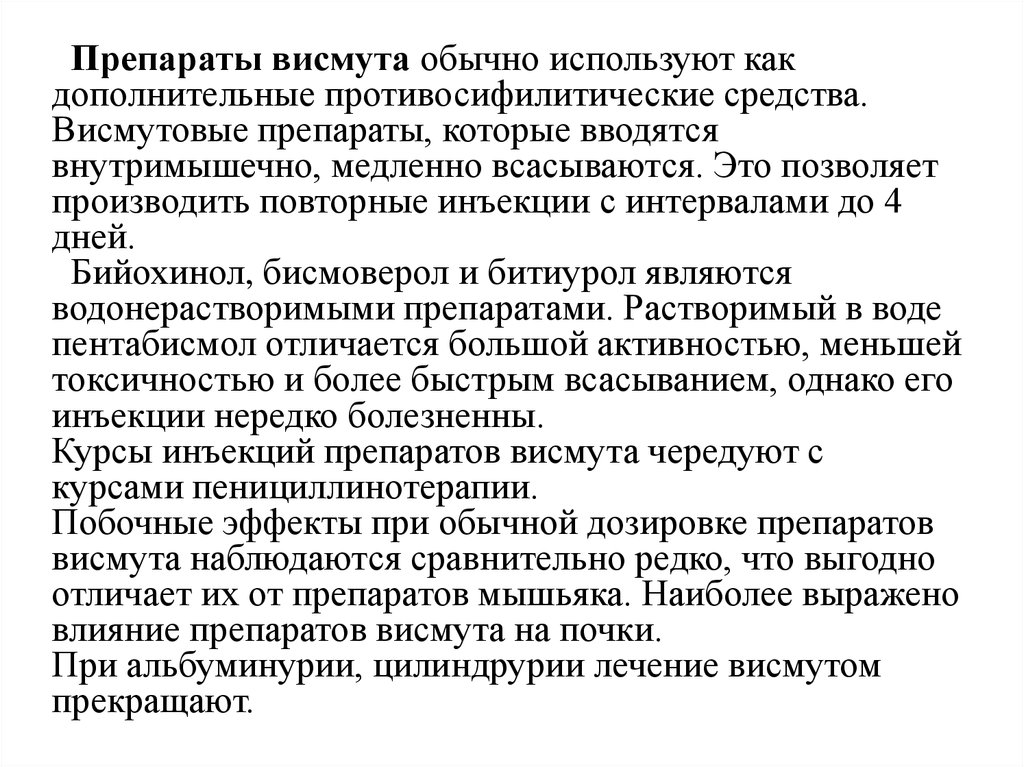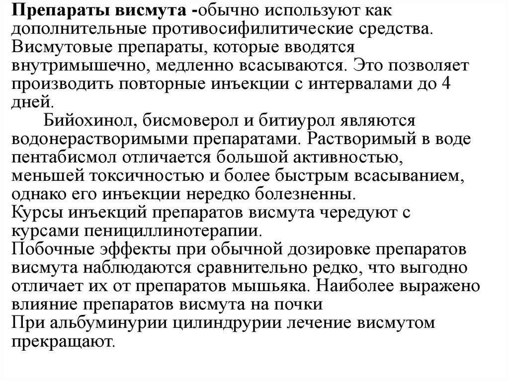 Препараты висмута -обычно используют какдополнительные противосифилитические средства.
