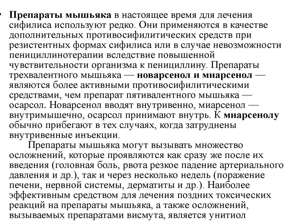 • Препараты мышьяка в настоящее время для лечениясифилиса используют редко. Они применяются в качестве