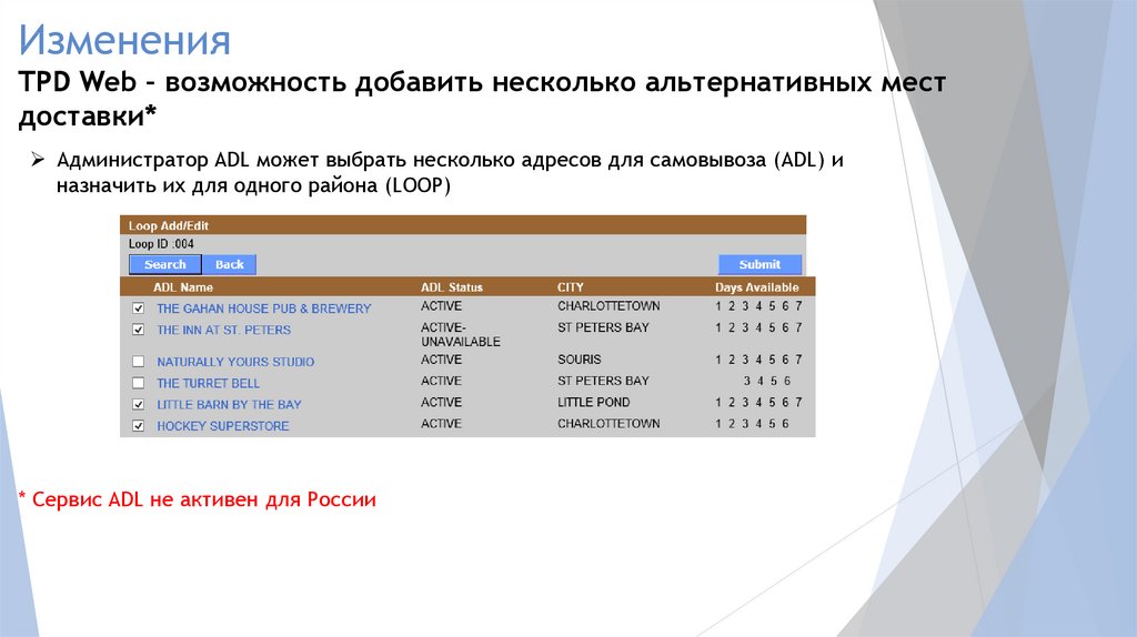 Администратор ADL может выбрать несколько адресов для самовывоза (ADL) и