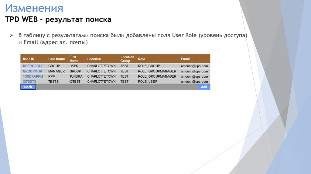 В таблицу с результатами поиска были добавлены поля User Role (уровень доступа)
