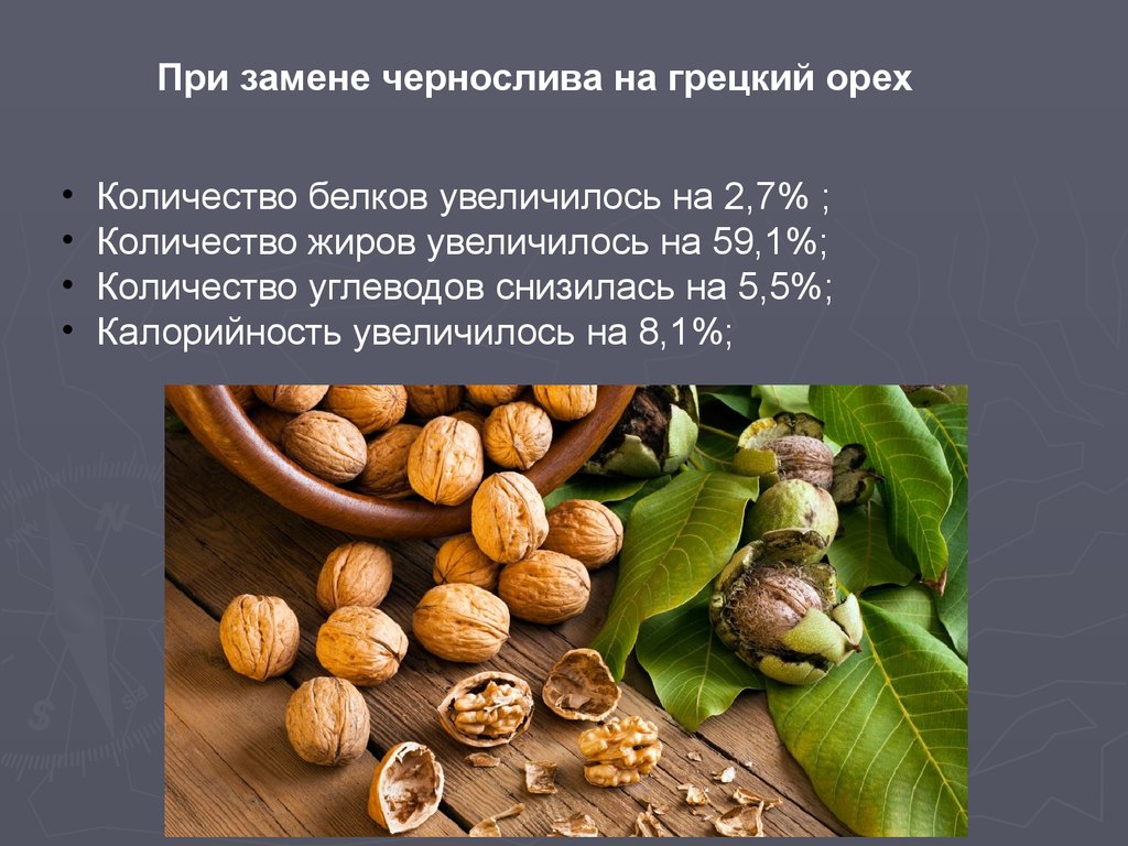 При замене чернослива на грецкий орехКоличество белков увеличилось на 2,7% ;