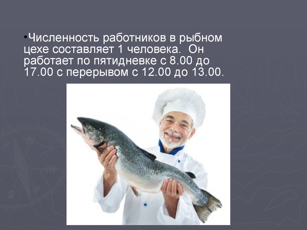 •Численность работников в рыбномцехе составляет 1 человека. Он