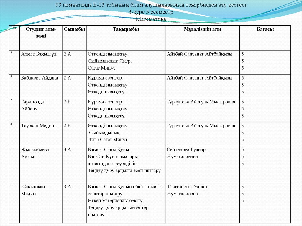 93 гимназияда Б-13 тобының білім алушыларының тәжірбиеден өту кестесі3-курс 5 сесместр