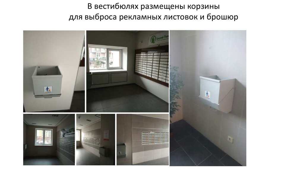 В вестибюлях размещены корзиныдля выброса рекламных листовок и брошюр