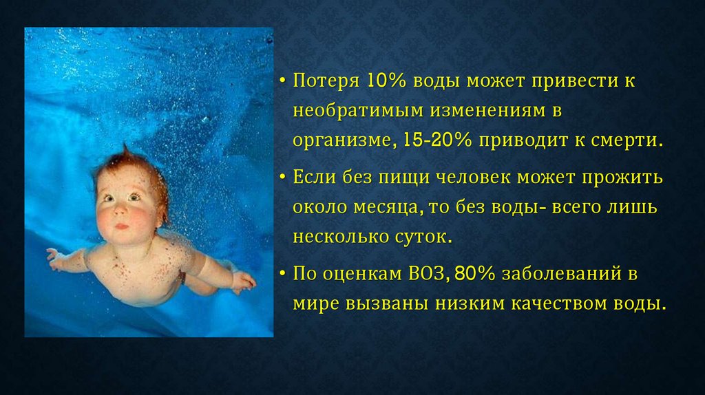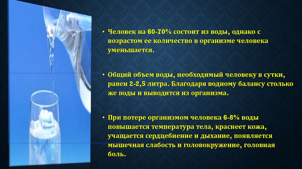 • Человек на 60-70% состоит из воды, однако свозрастом ее количество в организме человека